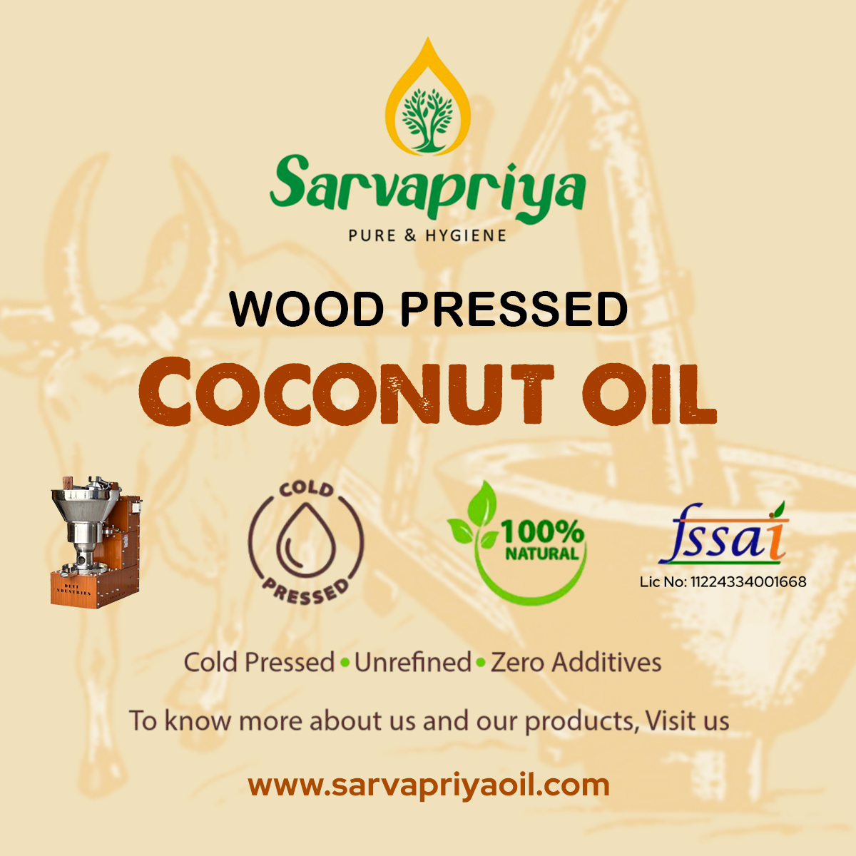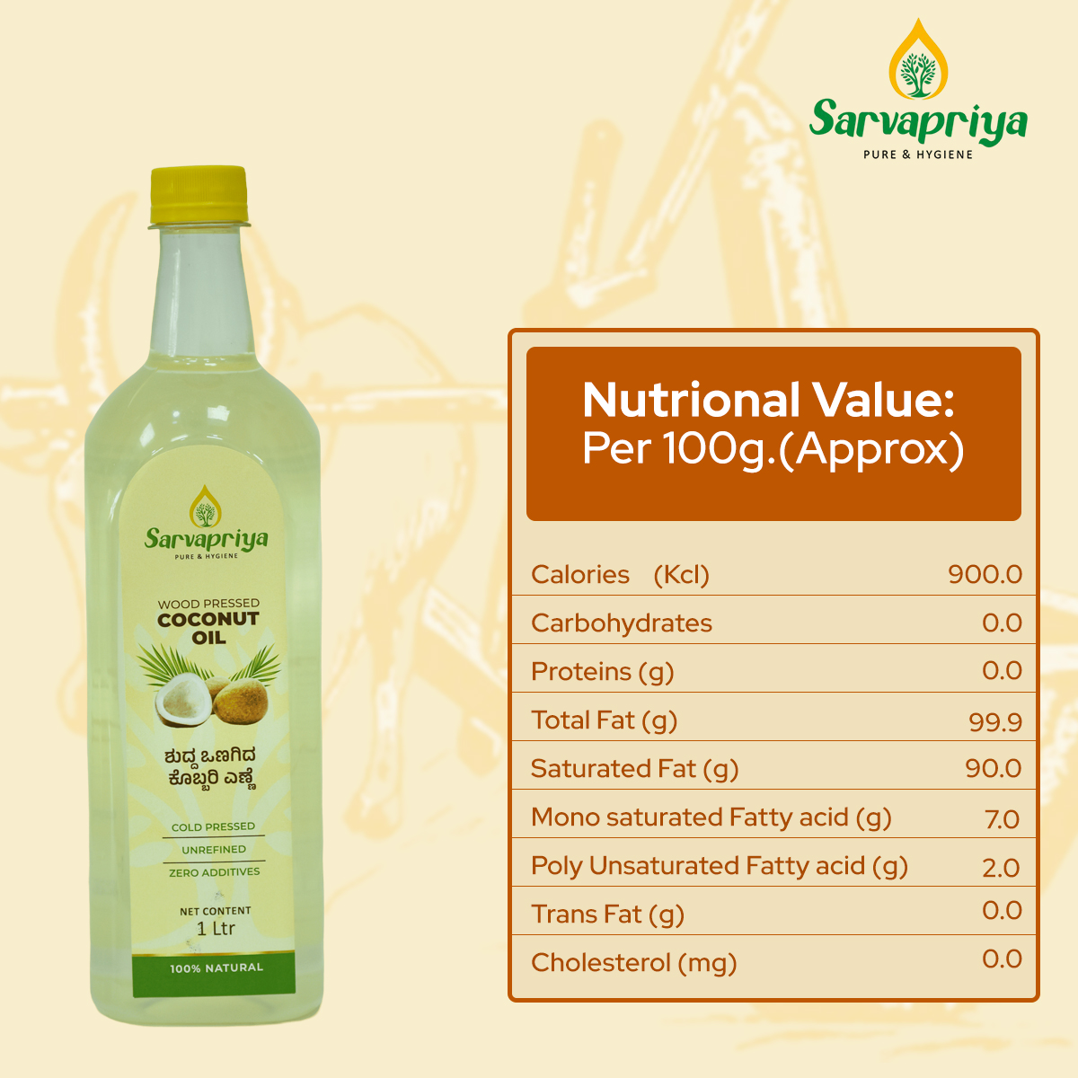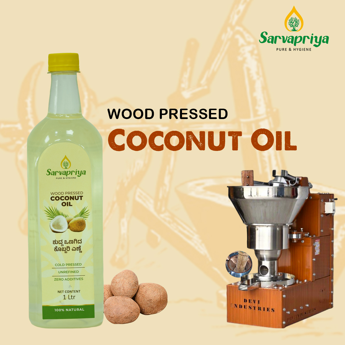 Experience the purity and health benefits of Sarvapriya Wood Pressed Coconut Oil. A perfect addition to your daily routine, from cooking to skincare.